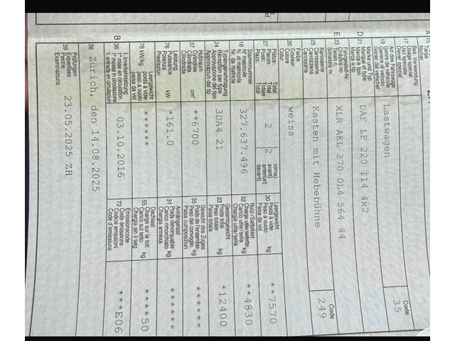 | Zubehör | ADR / SDR, Streugerät, Retarder/Intarder, Hebebühne, Dieselpartikelfilter, Hydraulik (Nebenantrieb), Spoiler, Anhängerkupplung, Differentialsperre, Traktionskontrolle, ABS, Nebellampen, Fahrtenschreiber, Radio / CD, Klima, Multifunktionsanzeige, Tempomat, Zentralverriegelung, El. Aussenspiegel, El. Fensterheber |