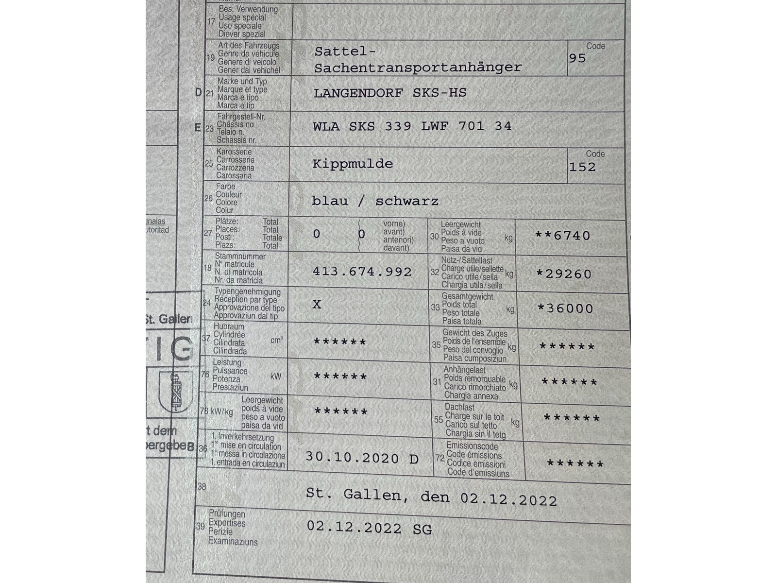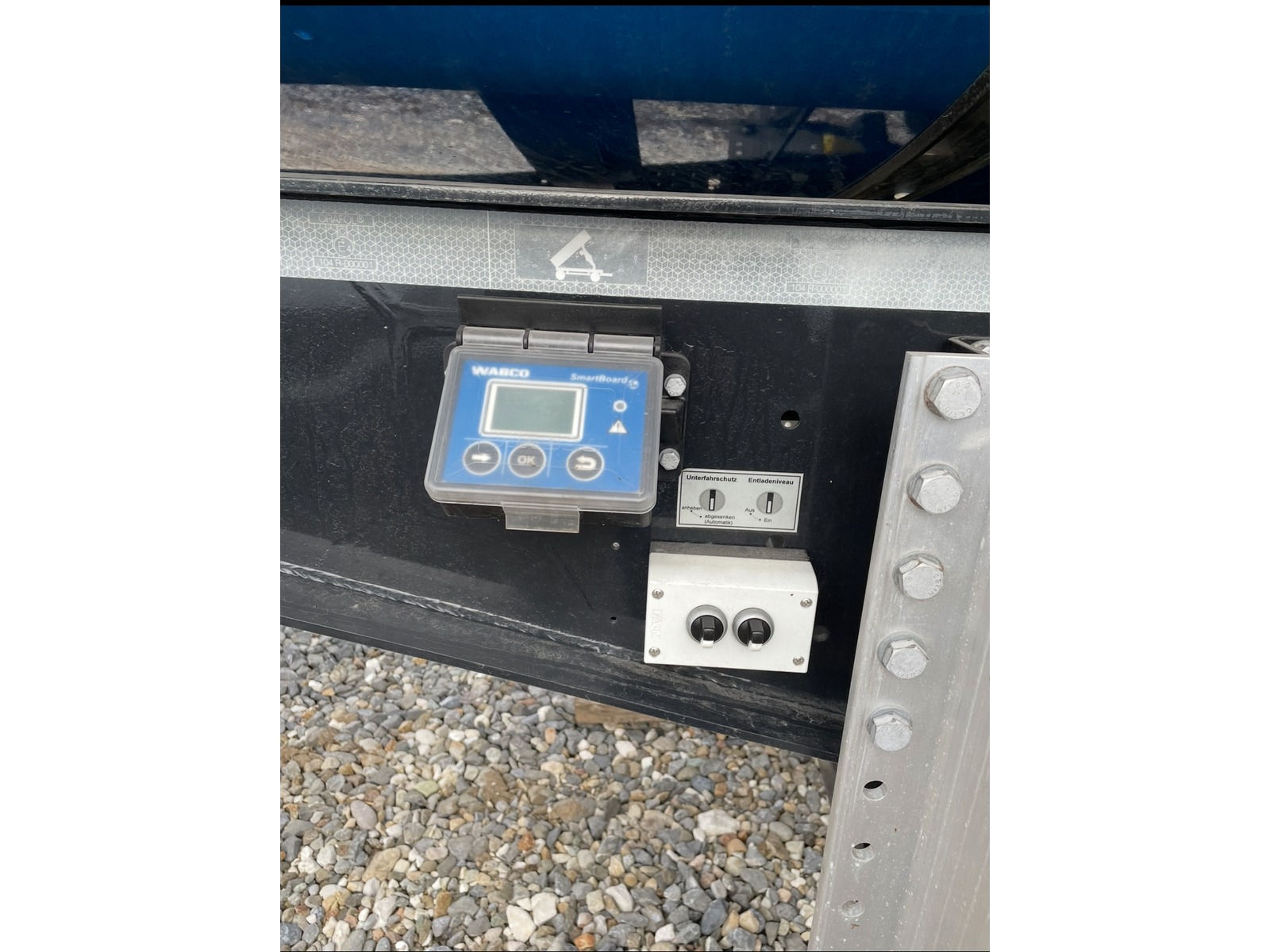1 Achse liftbar, 3 Achse Nachlaufgelenkt/ sperrbar. Pneumatisch hochklappbarer Unterfahrschutz. Fertigerbremse, Rollverdeck, Thermoisoliert. Waage.