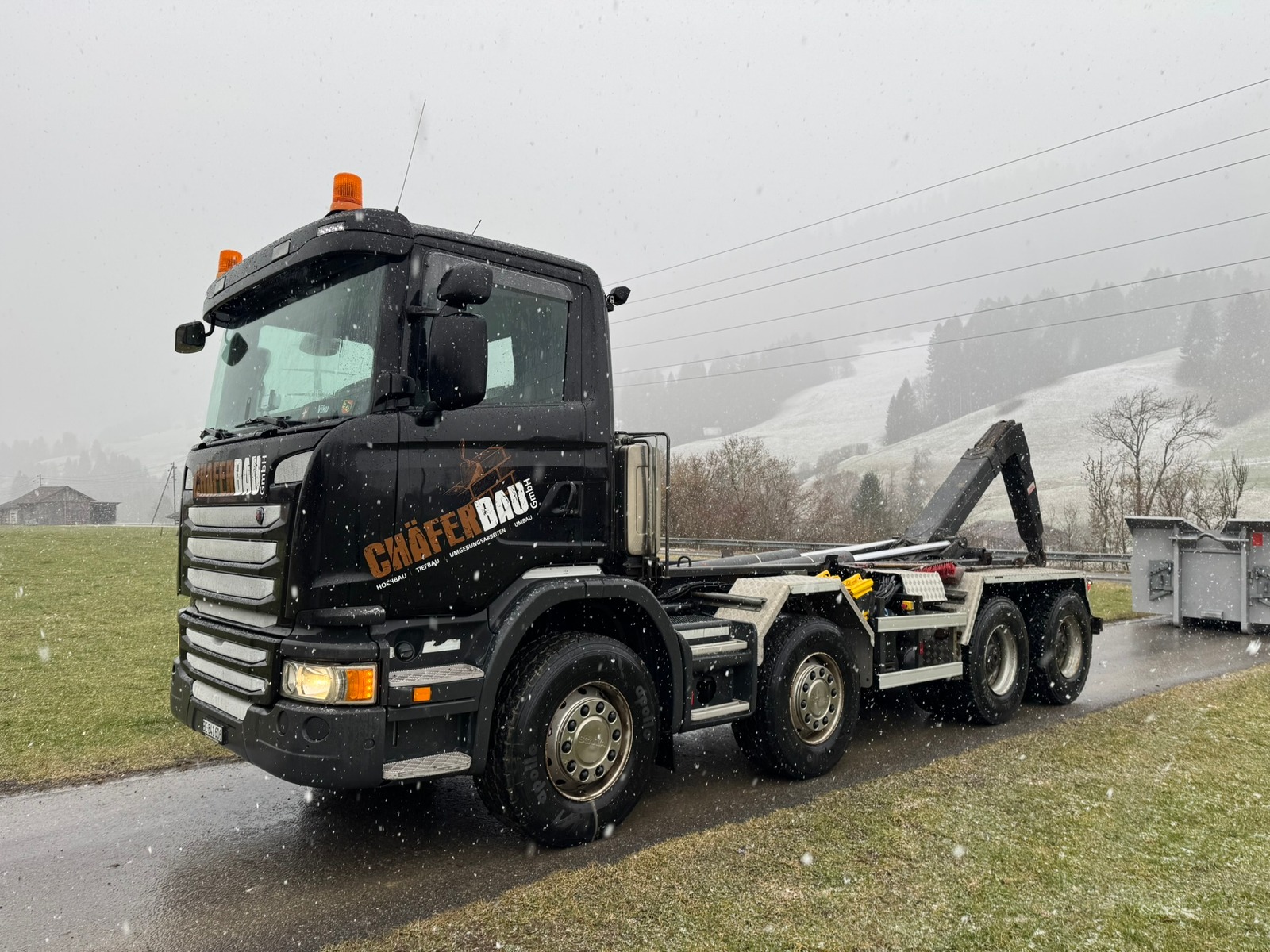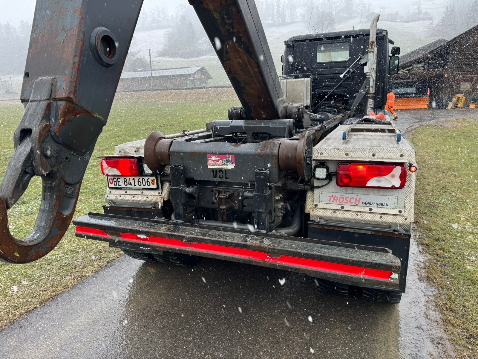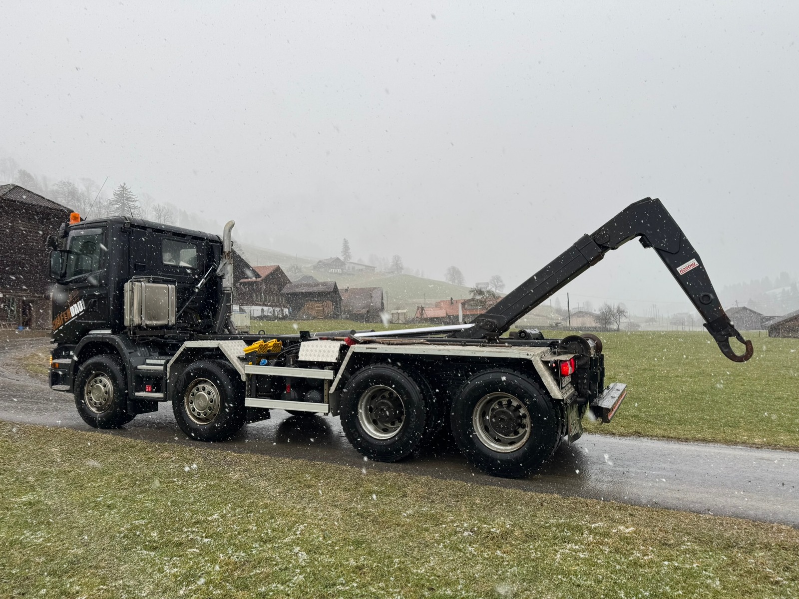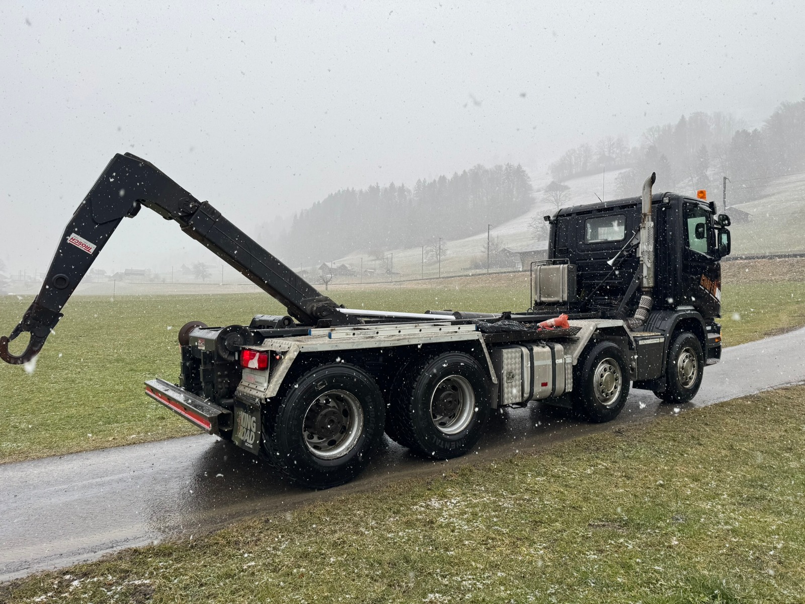 Das Fahrzeug ist als 4-Achser aufgebaut und verfügt über ein hochwertiges Hakengerät von Trösch AG. Ausgestattet mit Retarder und Motorbremse bietet der LKW eine starke Bremsleistung und hohen Fahrkomfort – ideal für anspruchsvolle Einsätze im Baustellen- und Containertransport.