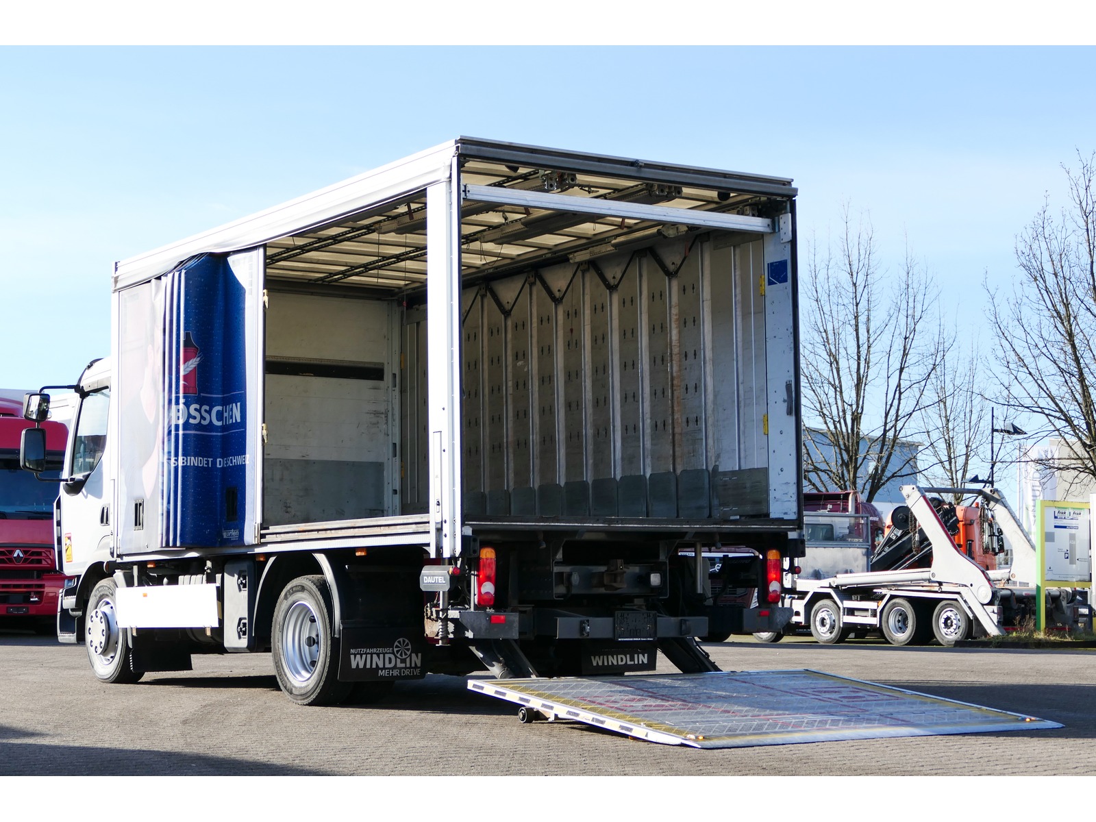| Zubehör | El. Fensterheber, El. Aussenspiegel, Tempomat, Multifunktionsanzeige, Klima, Radio / CD, Fahrtenschreiber, Nebellampen, ABS, Differentialsperre, Anhängerkupplung, Hebebühne, Int. Nr. für Anfragen: 0126012 Getränkewagen Allgemeinzustand : sehr gut Motorstunden : 7.030 h Leistung : 210 kW / 280 PS ABS EBS Differentialsperre Hinterachse Dachlucke mechanisch Federung : Luft / Luft (Vollluft) CD - Radio / USB / AUX /Bluetooth Aufbwahrungsbox linke seite / Kunststoff AdBlue rechte seite Luftgefederter Komfortfahrersitz Klimaanlage Tempomat Rückfahrkamera elektrische Fensterheber Fahrer / Beifahrer elektrisch verstellbar undbeheizbare Spiegel Bordcomputer Sonnenblende außen Transparent Ladebordwand : Dautel, Tragekraft bis max. 2.000 kg Aufbau : Pritsche Plane Getrankewagen Verschleissboden Holz erhohte Stirnwand Aluminium Schiebeplanenaufbau mit Alu-Paneelen Maße (Laderaum/Ladefläche) Laderaumlänge : 5.000 mm Laderaumbreite : 2.490 mm Laderaumhöhe : 2.150 mm |