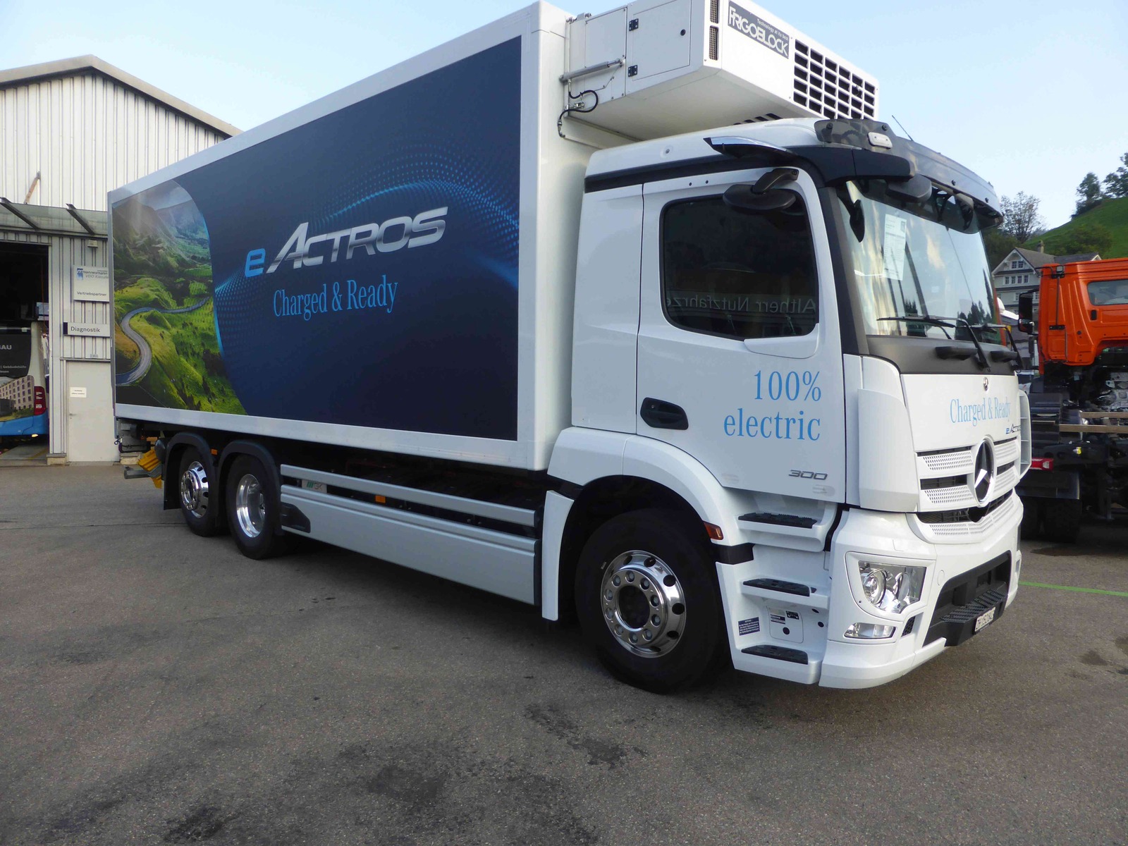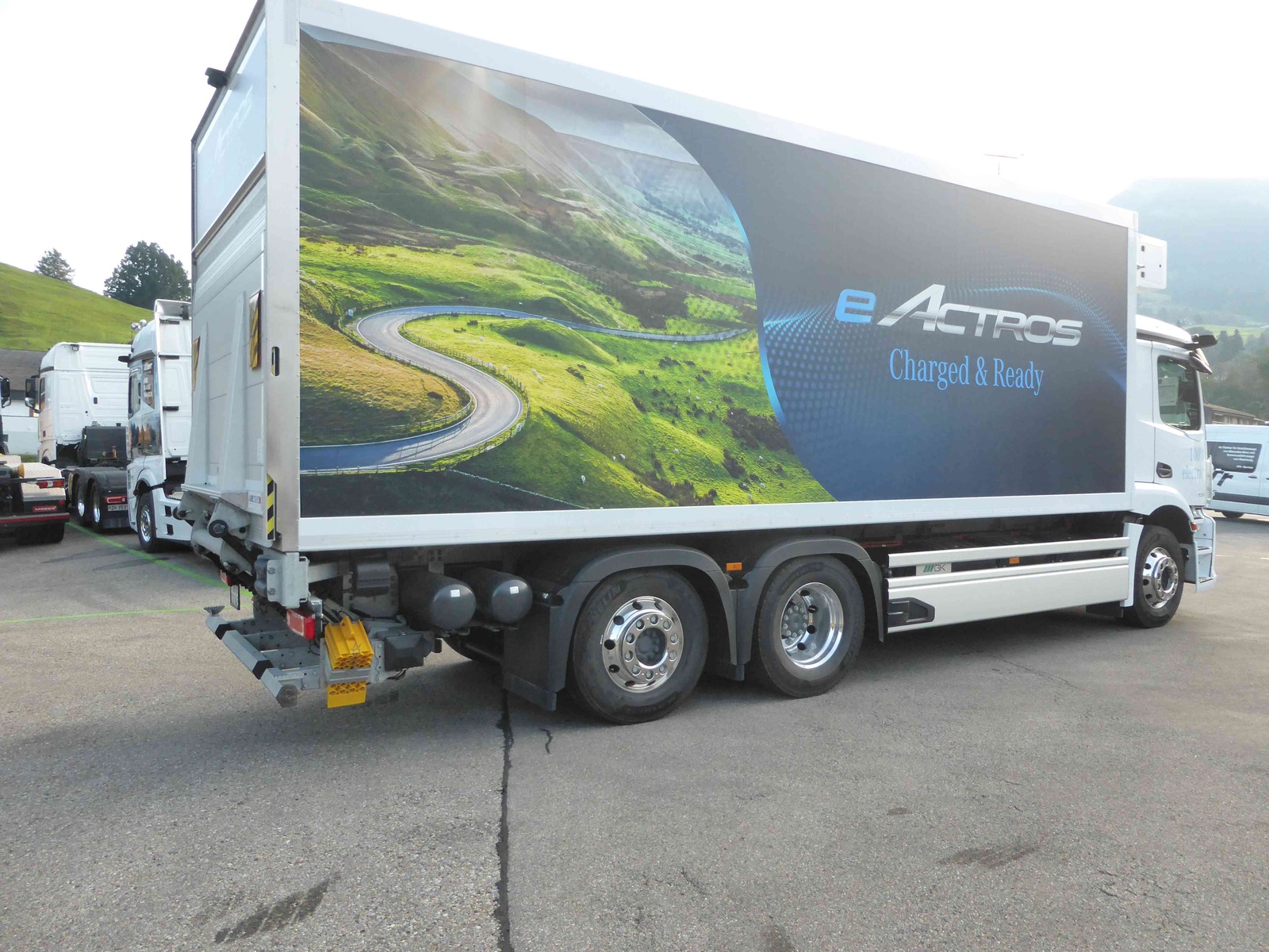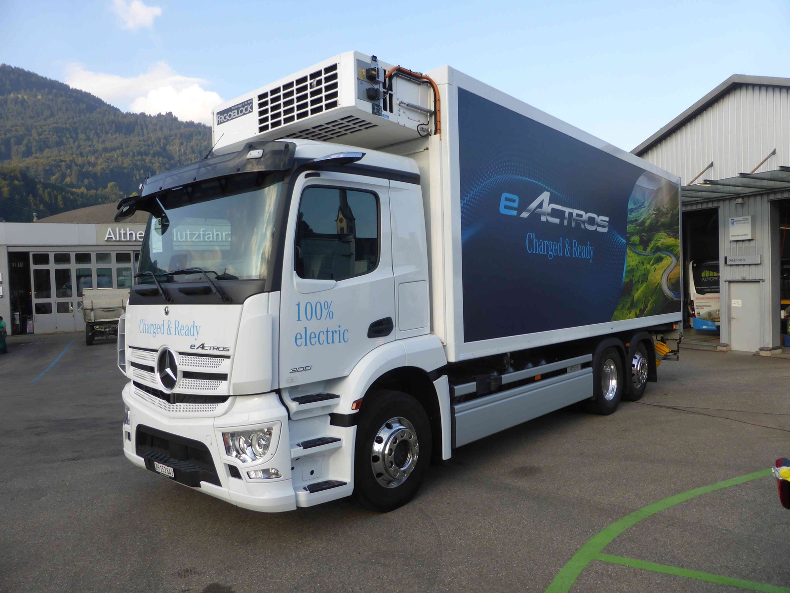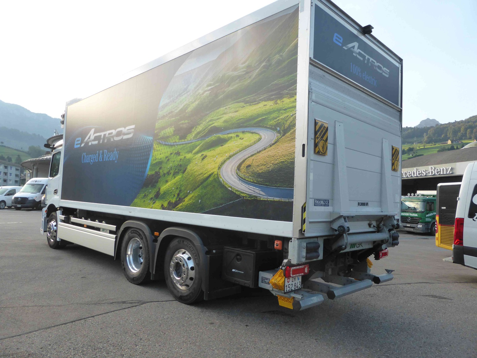 Test Drive Mercedes-Benz eActros 300L mit Grünenfelder Kühlkofferaufbau und Mammutlift Hebebühne.