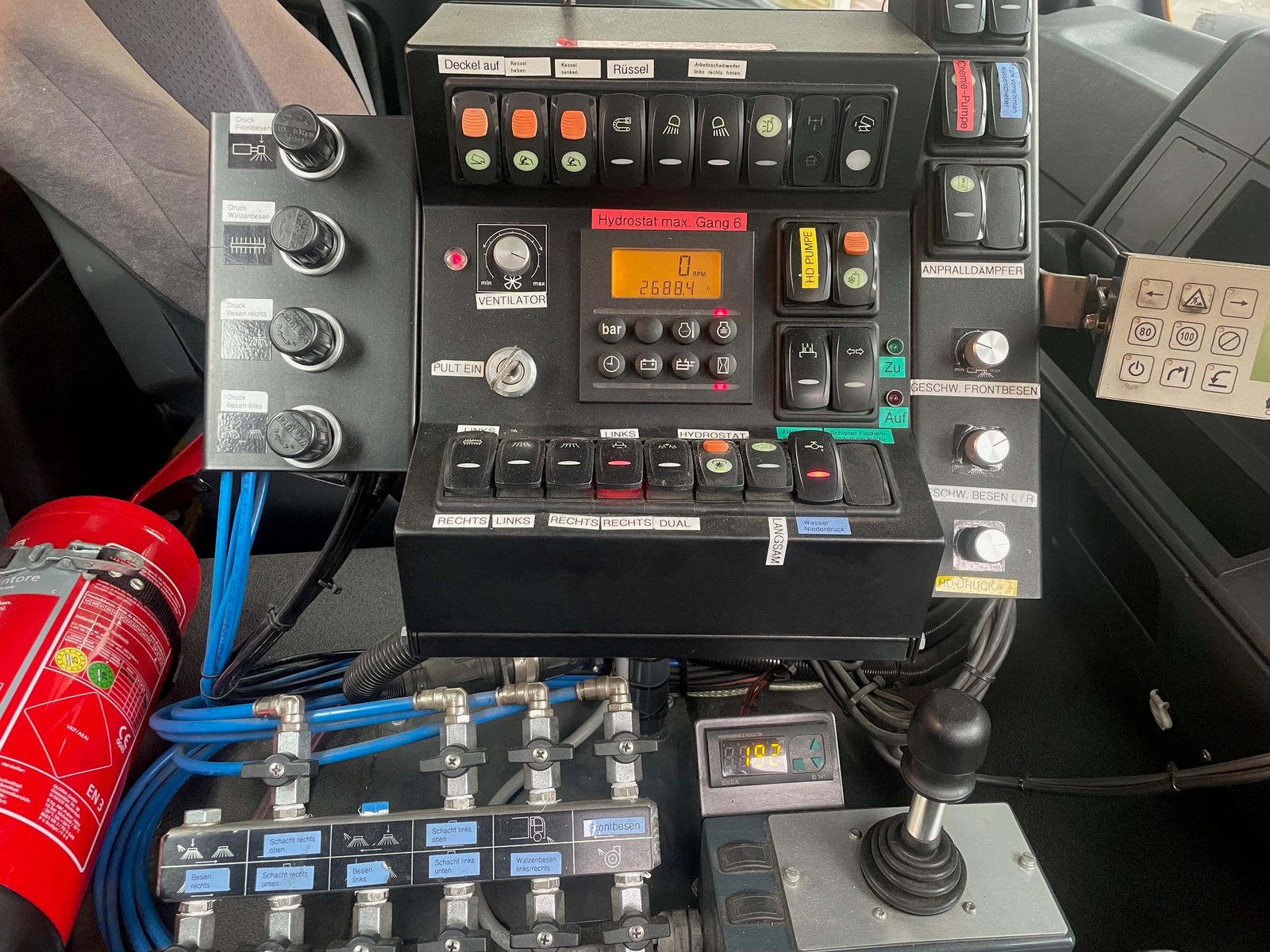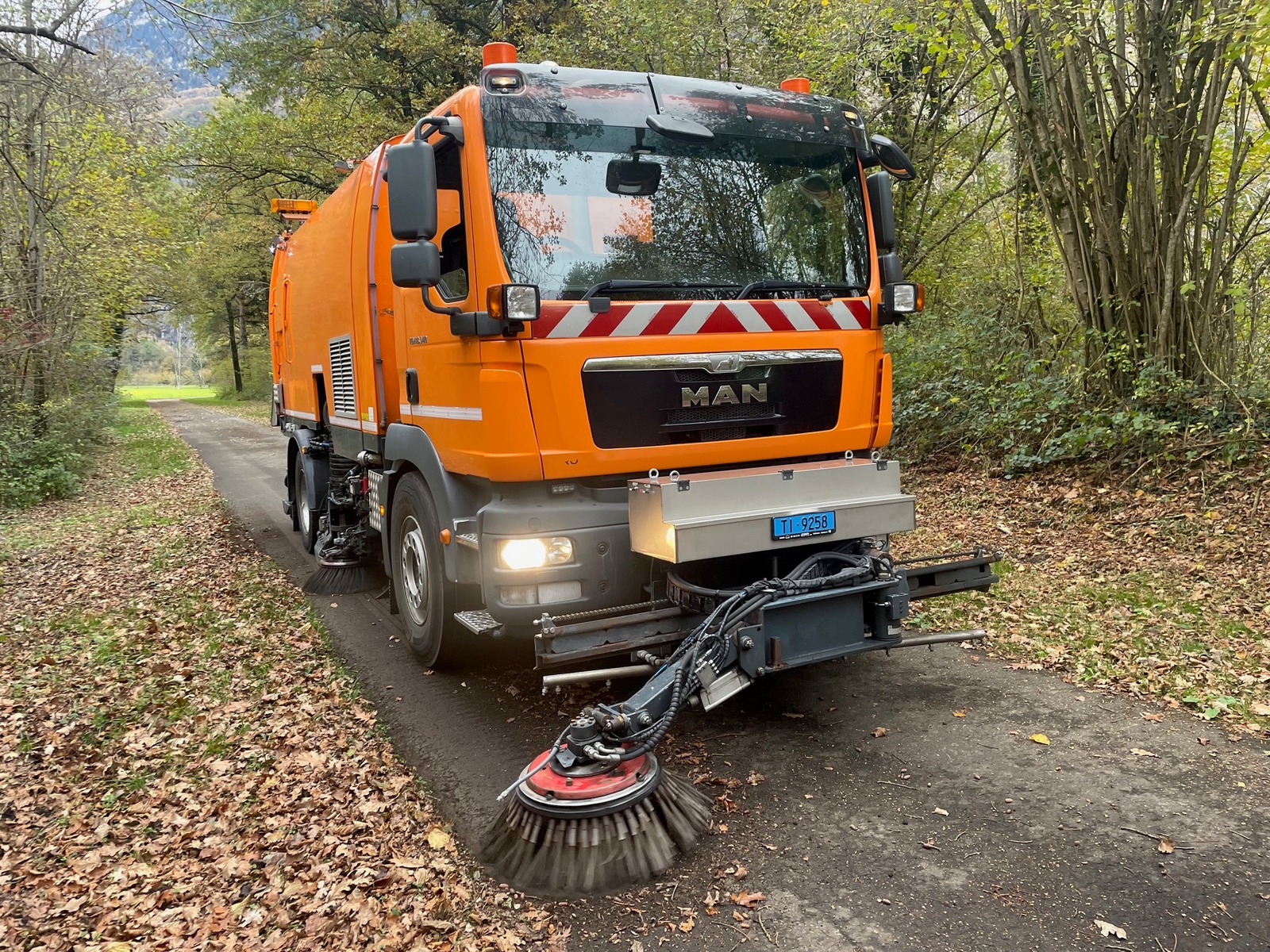 Kehrgutbehälter 7m3, duales Kerhsystem rechts/links, Zusatzwassertank hinter Kabine, Wassertankvolumen kpl.: 3500 Liter, Flächenabsaugung hinten 3-teilig, Frontbesen mit Seitenverschiebung rechts/links, Frontwaschbalken, Laubsaugeinrichtung hinten an Klappe, |
