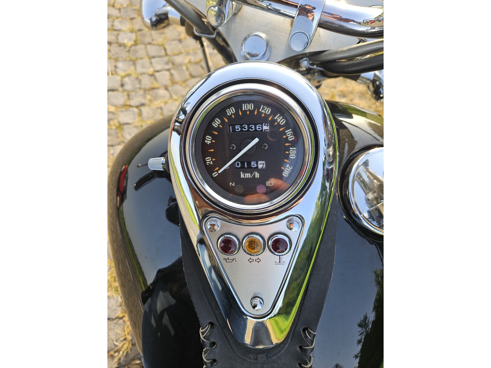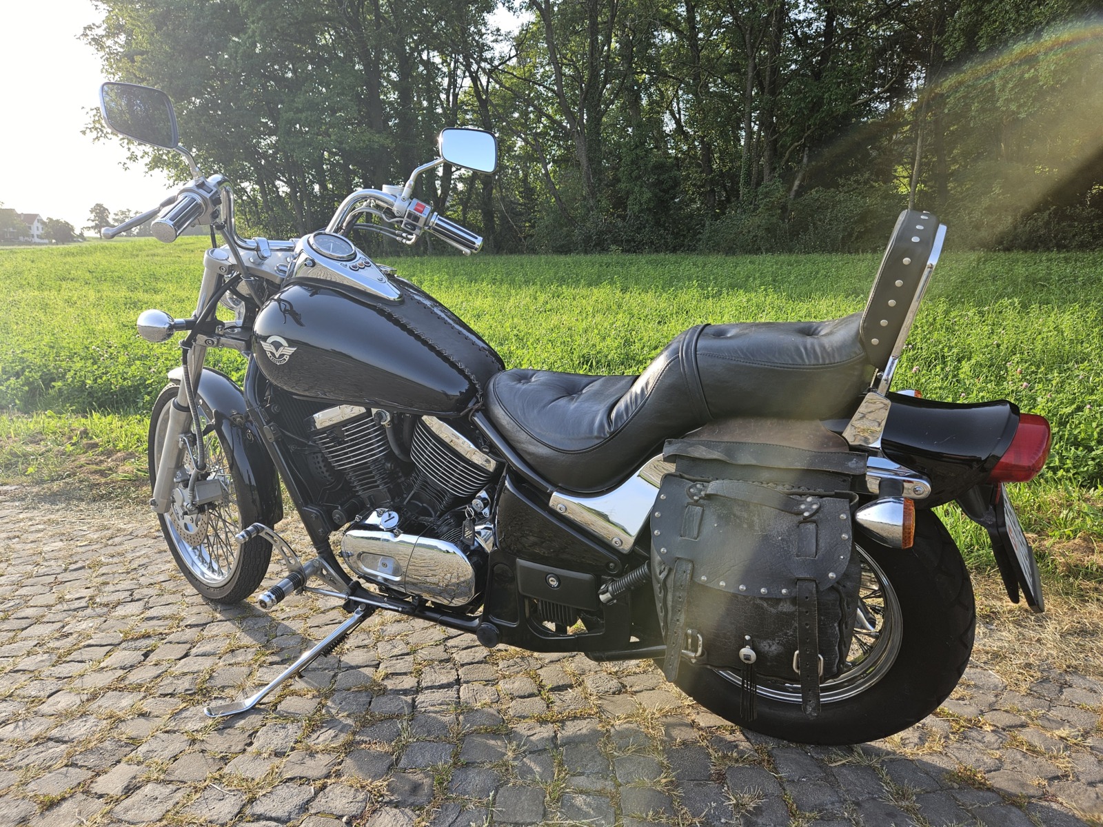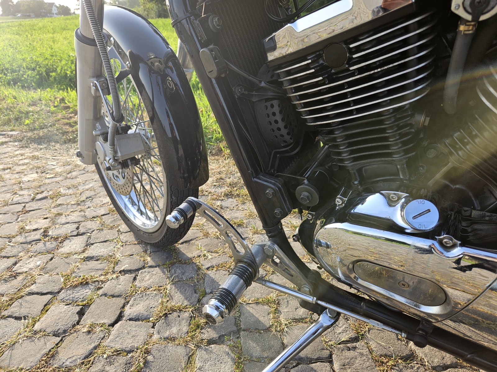 Chopper, gepflegt-wenig gefahren, 4Takt, 2Zylinder V-Motor, Federung: Teleskopgabel vorne, Schwinge mit zwei Federbeinen hinten, Bremsen: Einscheibenbremse vorne, Trommelbremse hinten, Leergewicht: 244 kg, Tankvolumen: 15l, Sitzhöhe: 720 mm, Rückenlehne, Speichenräder, Leder-Satteltaschen beidseitig, nach vorne versetzte Fussraster - im Ausweis eingetragen, geeignet für Personen ab ca.1,7m, kann nach Vereinbarung Probegefahren werden