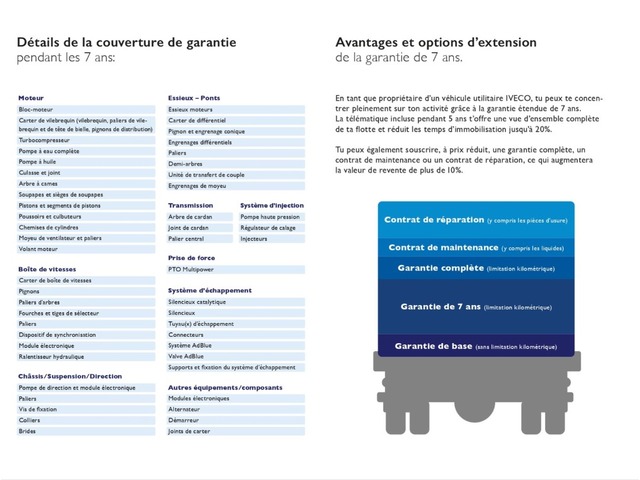 | Zubehör | Traktionskontrolle, ABS, Nebellampen, Radio / CD, Navigationssystem, Klima, Multifunktionsanzeige, Tempomat, Zentralverriegelung, El. Aussenspiegel, El. Fensterheber, Pack confort : Prise USB côté conducteur, Radio numérique DAB+ avec écran tactile 7 , reconnaissance vocale, Carplay/Android avec câble, Phares antibrouillard, Climatisation manuelle, Régulateur de vitesse, Siège conducteur Confort, avec accoudoir et soutien lombaire, réglable en hauteur, inclinaison et direction longitudinale, à suspension hydraulique, DRIVING ASSISTANT : Volant en cuir avec touches de fonction pour la radio, le téléphone, le menu, Assistance d'embouteillage (traffic jam assist), Centrage de voie avancées y compris détection de Hands-off au volant, Régulateur de vitesse adaptif (ACC) avec Stop&Go, Frein de stationnement électrique, Ressort semi-elliptique renforcé arrière, Rétroviseurs pour la largeur de la superstructure 2200 mm avec miroir grand angle réglable, Prise électrique pour remorques 12V / 13 pôles, Traction Plus avec assistant de descente, Caméra de recul non montée, |