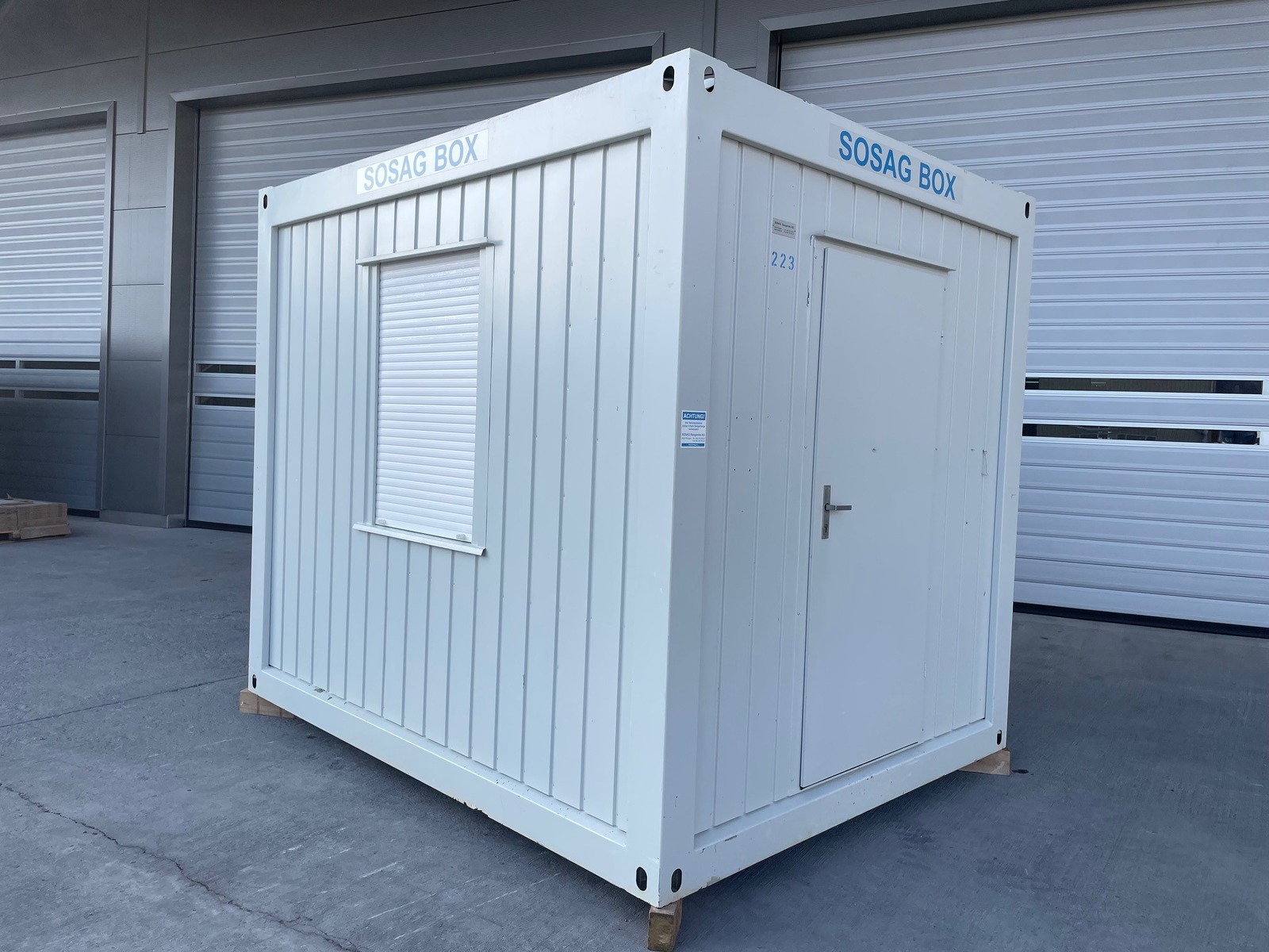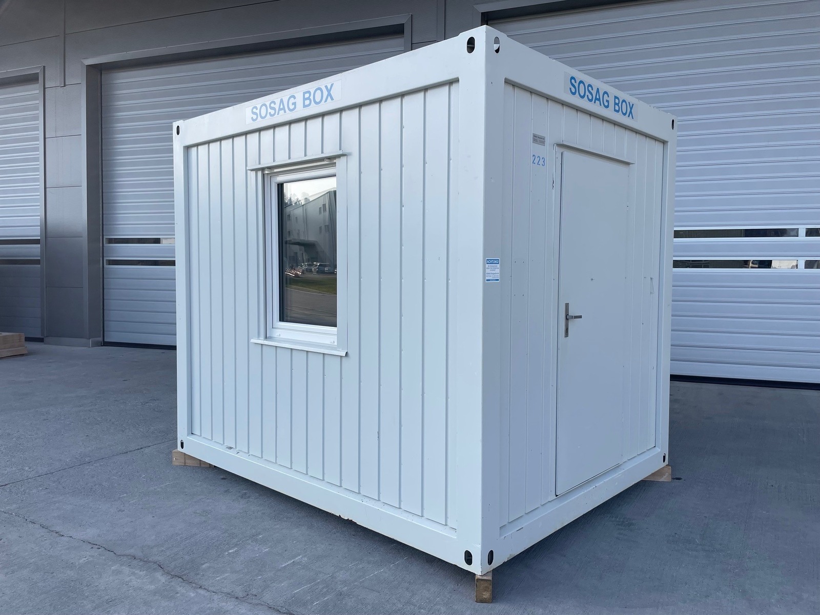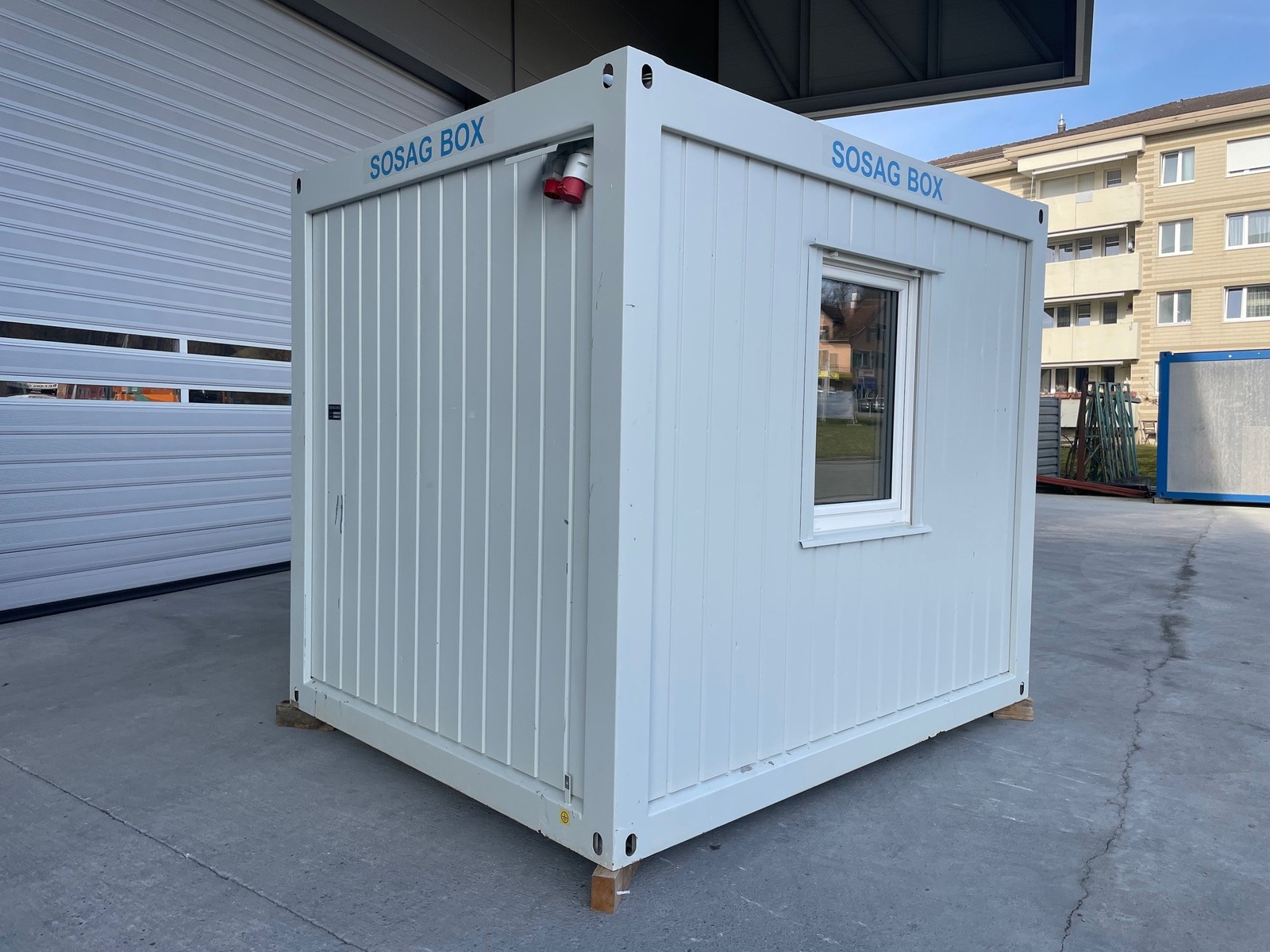 Bürocontainer 3.0m, sehr guter Zustand, stirnseitige Türe, längsseitiges Fenster mit Rollladen, Licht, Heizung, diverse Elektroinstallationen, Gewicht 1600kg!