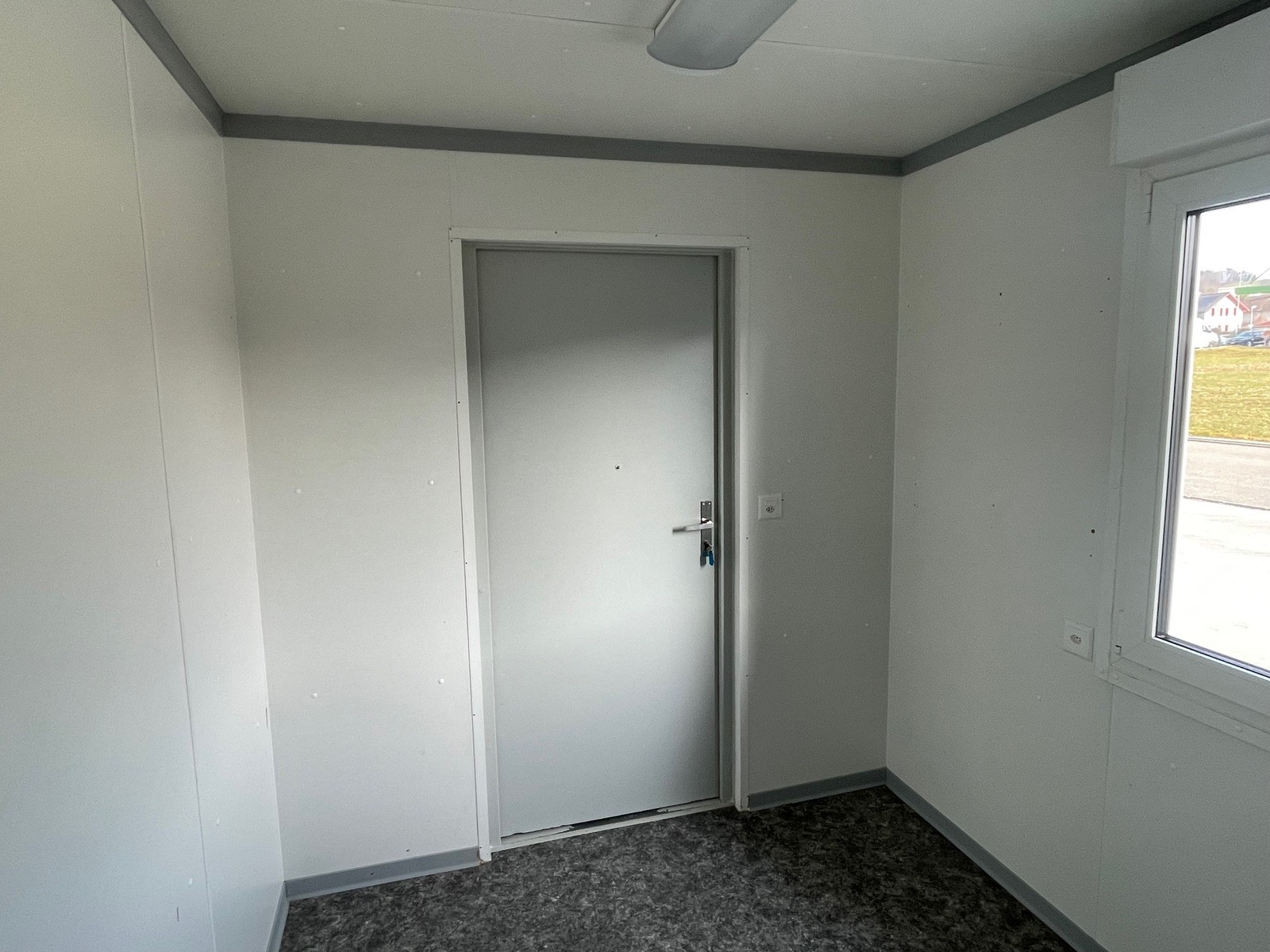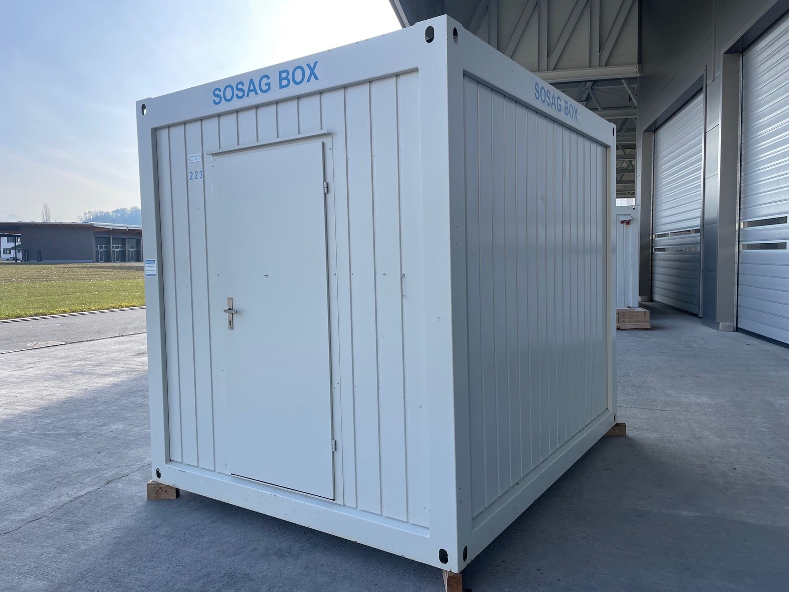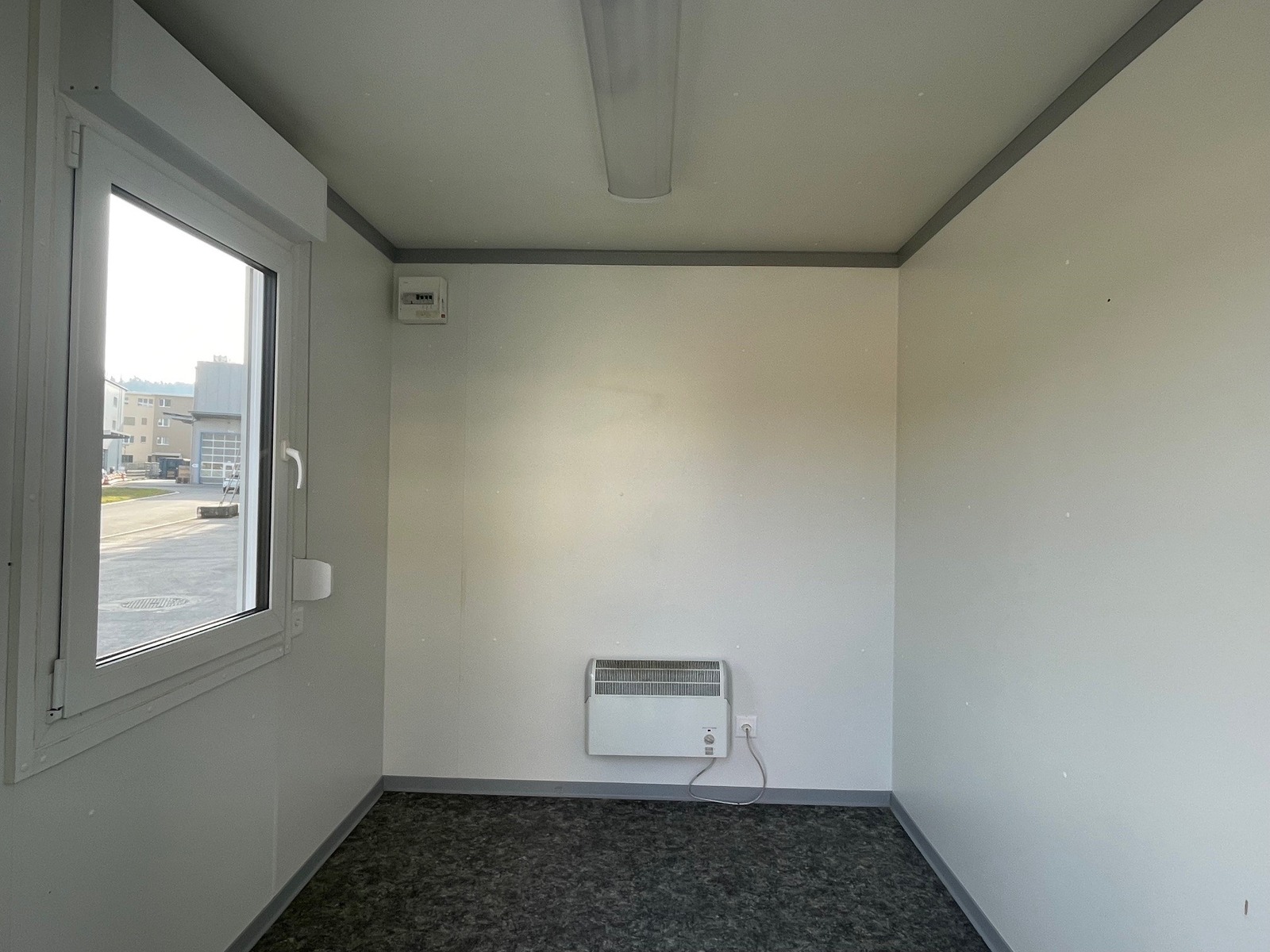 Bürocontainer 3.0m, sehr guter Zustand, stirnseitige Türe, längsseitiges Fenster mit Rollladen, Licht, Heizung, diverse Elektroinstallationen, Gewicht 1600kg!