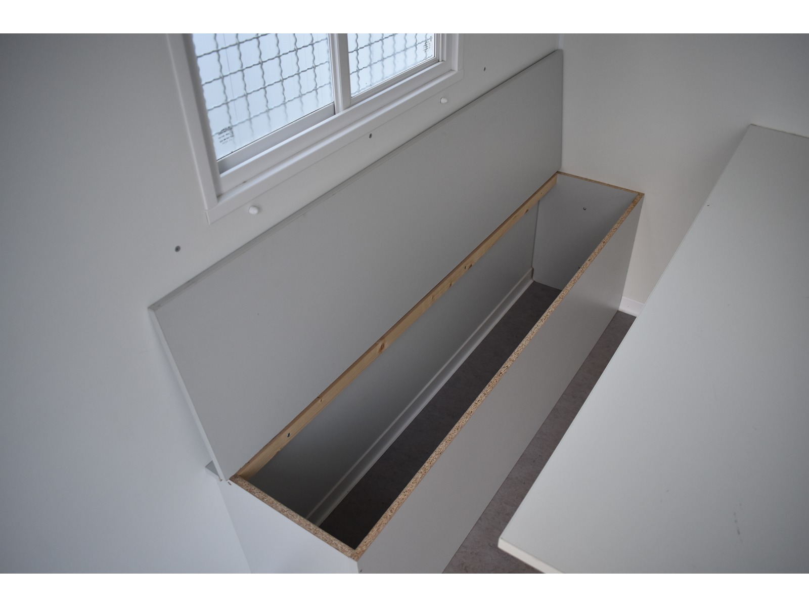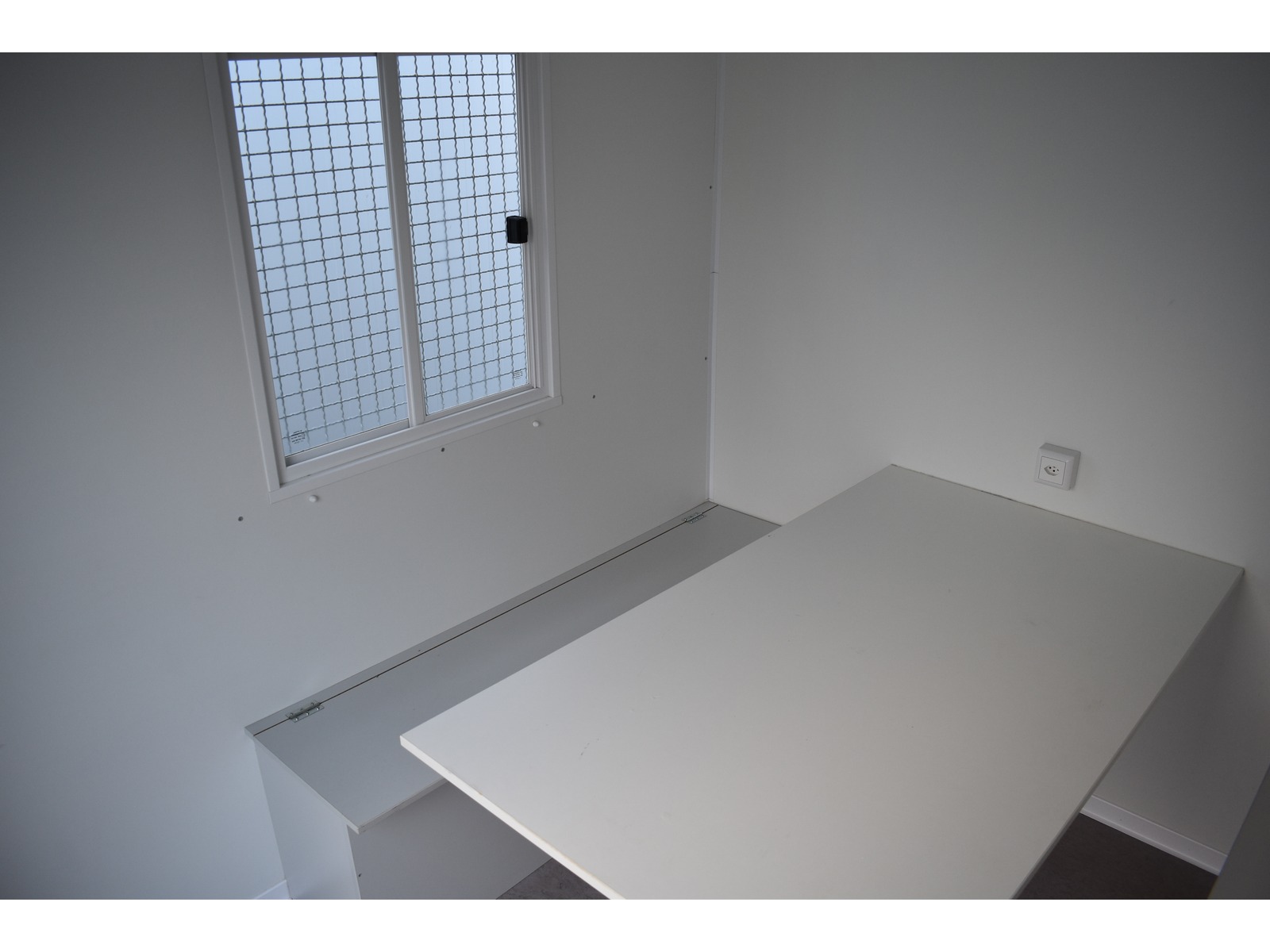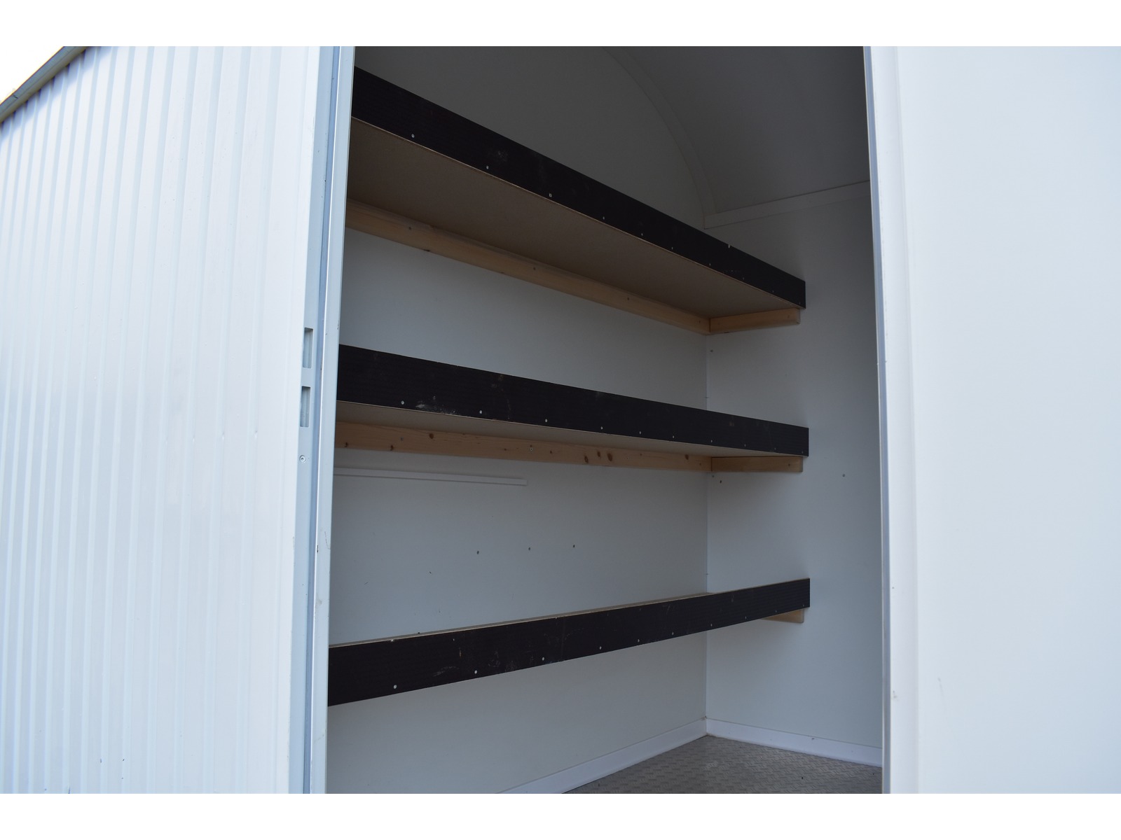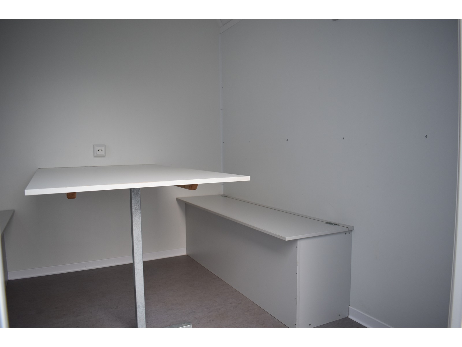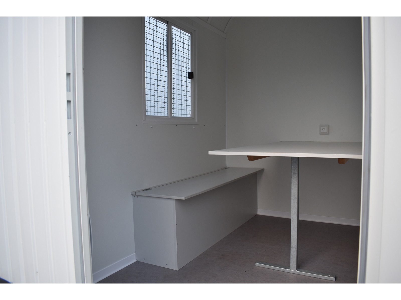 Werkzeugabteil vorne 1.5m mit Holzregal Werkzeughalter und Steckdose Mannschaftsabteil hinten 2.38m mit Kunststoffschiebefenster 2x Truhenbank und Tisch Elektro-Installation mit Steckdose und Heizlüfter 2kW