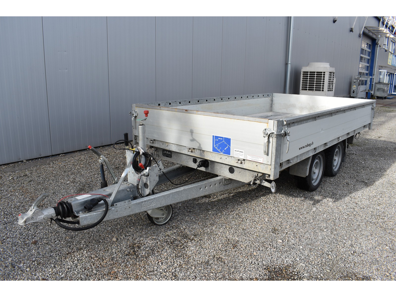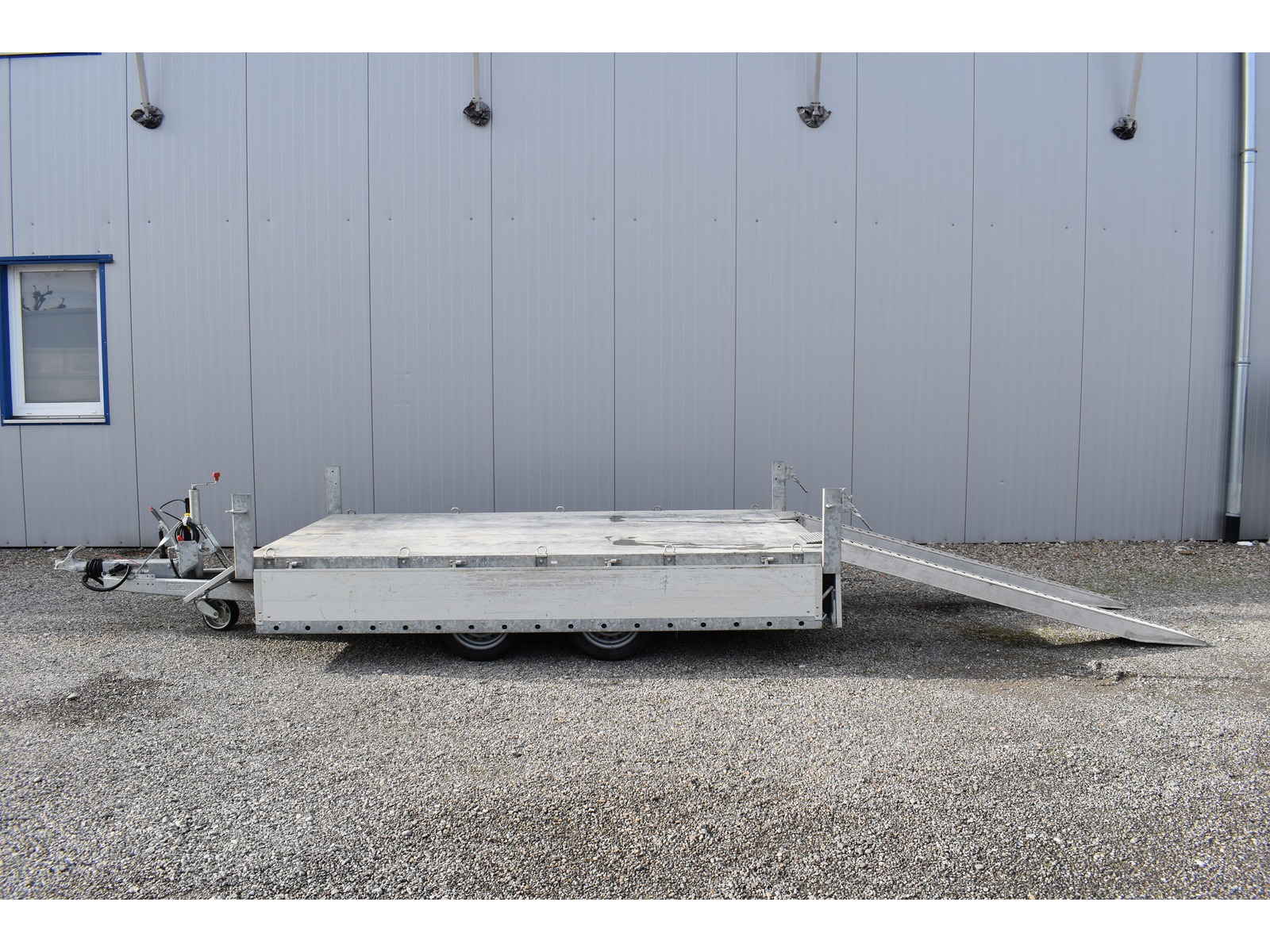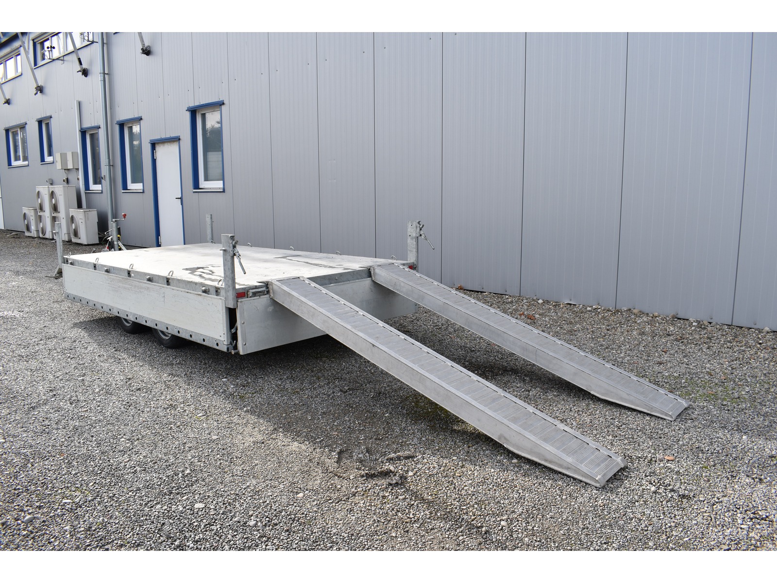 2 Alu-Auffahrrampen 2'560x280 mm, Tragkraft bei Achsabstand 1m=2'600kg und bei 1.5m =2'850kg, Einschubfach für Auffahrrampen, elektrische Pumpe mit Nothandpumpe, Ladeleitung für Batterie, Abstellstützen am Heck, Aluboden, Alu-Seitenläden 350 mm abklappbar, Binderinge seitlich versenkbar, Heckladen pendelnd oder abklappbar