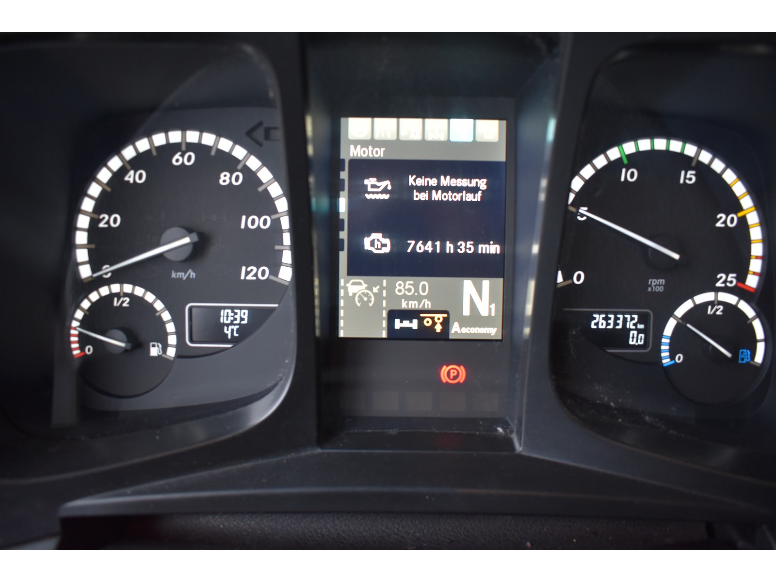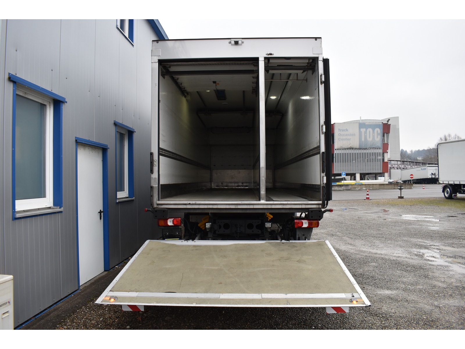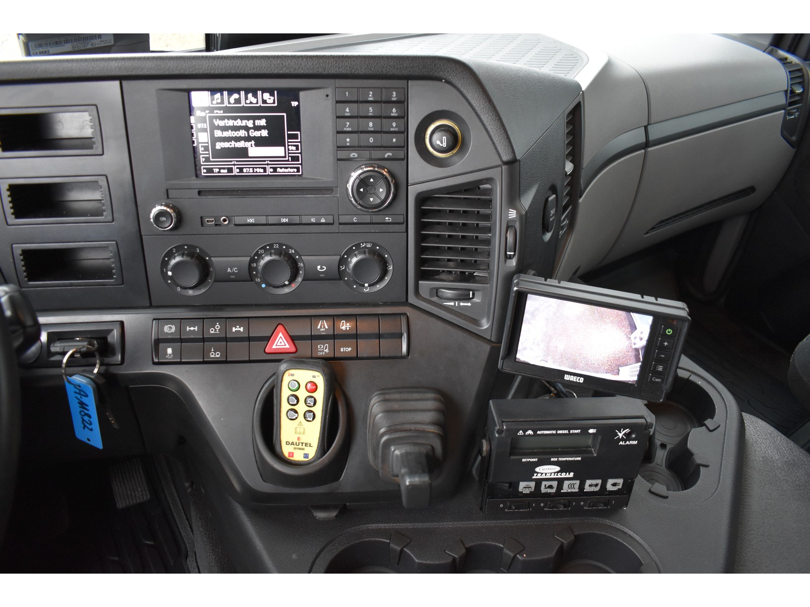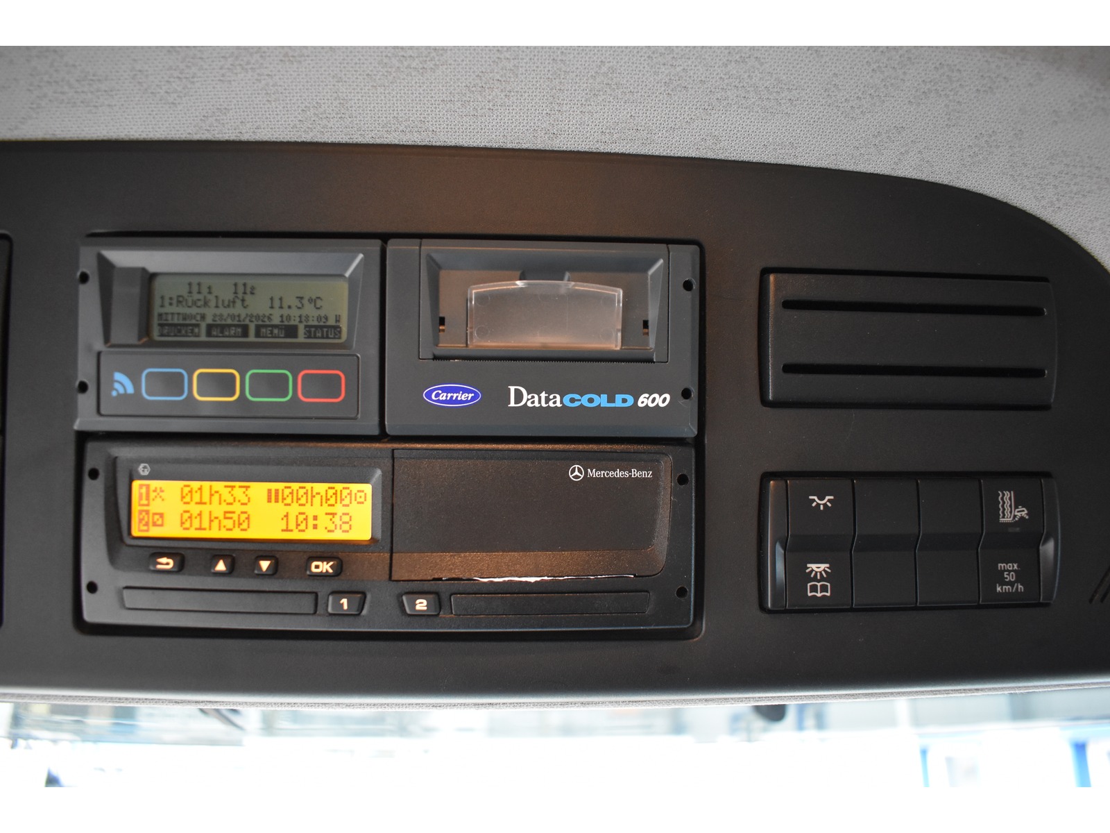 Retarder/Intarder, Kühlgerät, Hebebühne, Klima, Tempomat, 12-Gang Powershift Getriebe ClassicSpace-Kabine Radstand 5'200 mm längs verschiebbare Trennwand in der kleinen Zone Abstandsregeltempomat Anfahrassistent je 1 Zurrschiene seitlich Klimaanlage Kühlaggregat Carrier Supra 1'250 Mt Diesel- und Netzbetrieb Kunststoffboden Ladebordwand Dautel mit 1'500 kg Tragkraft Ladebordwand-Blatt 1'800 mm Luftfederung Hinterachse Multifunktionslenkrad Nachlaufachse liftbar-gelenkt Retarder Rolltor links pneumatisch öffnend zusätzlich 1 Flügeltüre rechts Rückfahrkamera Sitzheizung Spurassistent Wandstärke 50 mm Werkzeugkiste