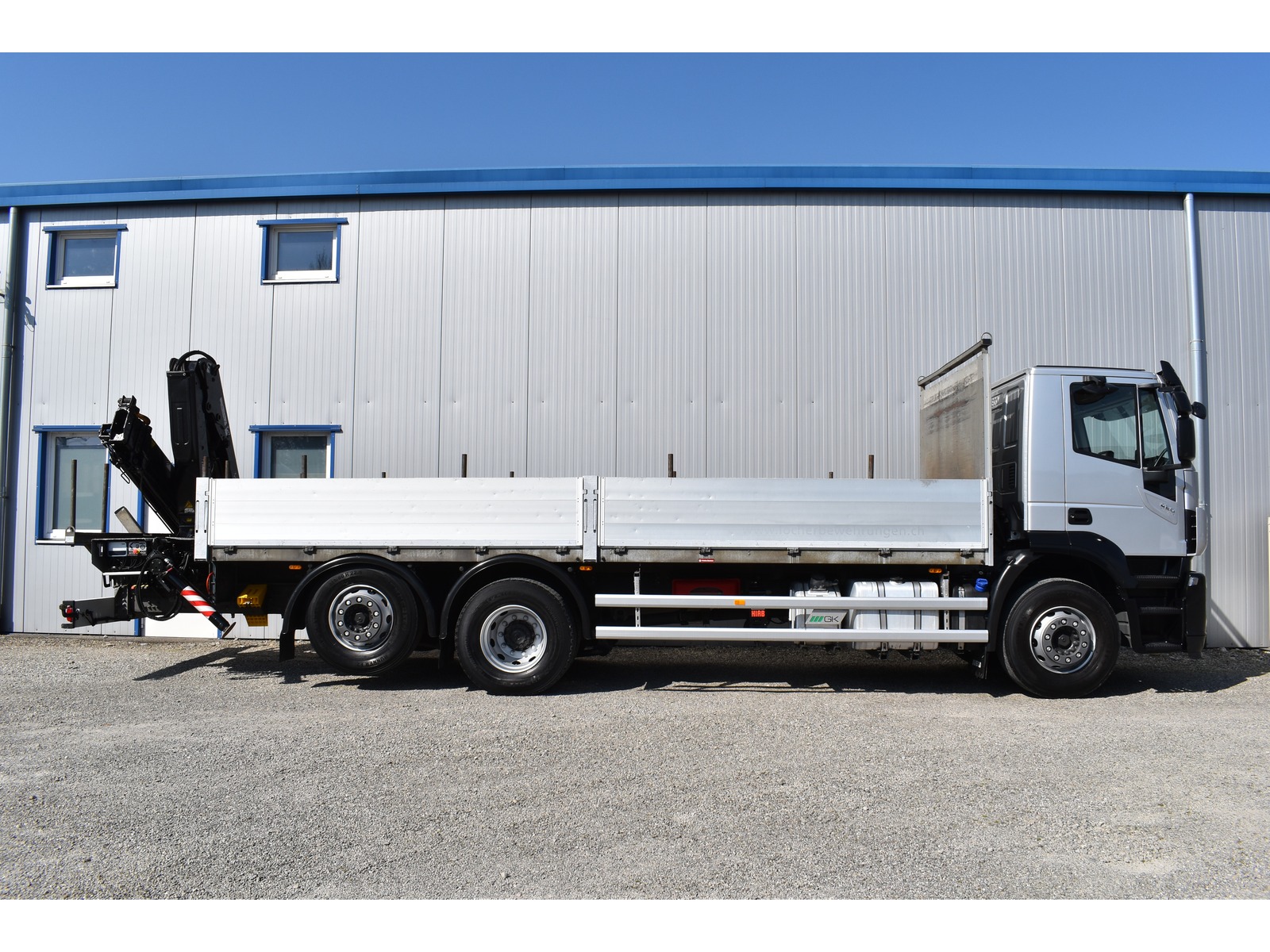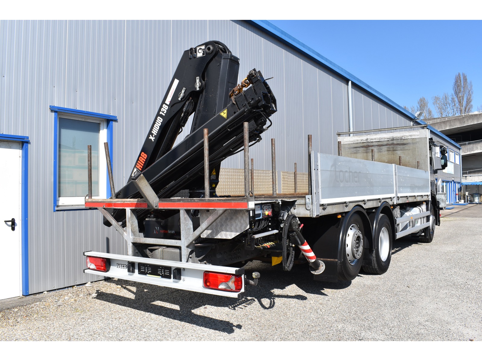 | Zubehör | Tempomat, Klima, Traktionskontrolle, Kran, Retarder/Intarder, Kran Hiab X-HiDuo 138 B-3 mit Funkfernbedienung 2 hydr. Abstützungen 3 hydr. Ausschübe max. Hubkraft 3'950 kg max. Reichweite 10.50m Alu-Seitenläden 600 mm nach aussen klappbar Holzfussboden Klimaanlage Luftfederung Hinterachse Multifunktionslenkrad Nachlaufachse liftbar-gelenkt Nebenantrieb Retarder Sitzheizung Spurassistent Tempomat Werkzeugkiste |